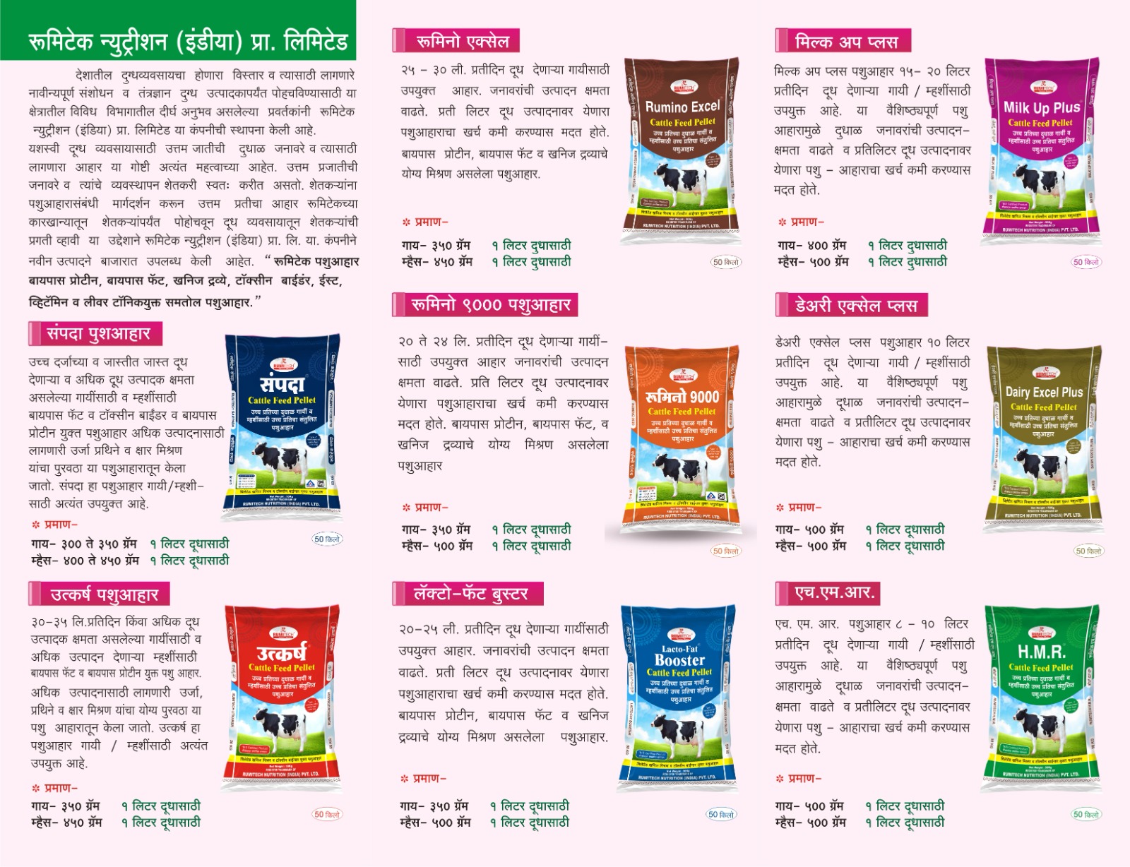 एच.एम.आर. पशुआहार ८ - १० लिटर प्रतिदिन दूध देणाऱ्या गायी आणि म्हशींसाठी अत्यंत उपयुक्त आहे. या वैशिष्ट्यपूर्ण पशु आहारामुळे दुधाळ जनावरांची उत्पादन क्षमता वाढते व प्रतिलिटर दूध उत्पादनावर येणारा पशु - आहाराचा खर्च कमी करण्यास मदत होते